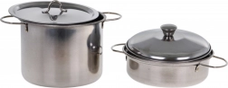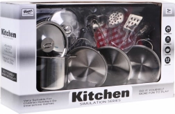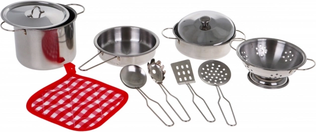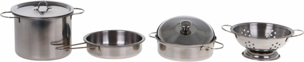 | | Visokokvalitetan set lonaca od nehrđajućeg čelika. Izgledom podsjeća na pravo kuhinjsko posuđe, samo u minijaturnom izdanju. Set je prikladan za djecu od 3 godine. Sigurno će obradovati svakog malog kuhara ili kuharicu. Set pozitivno utječe na dječju maštu i kreativnost te razvija strast prema kuhanju. |