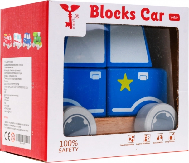 Slatki drveni policijski autić za djecu od 2 godine potiče finu motoriku, koordinaciju oko–ruka i logičko razmišljanje. Sastoji se od podvozja i četiri kocke koje se stavljaju na drvene klinove i tvore izgled policijskog vozila. Izrađeno od kvalitetnog drva i obojano netoksičnim bojama za sigurno igranje.