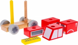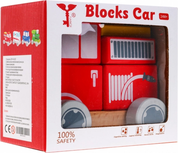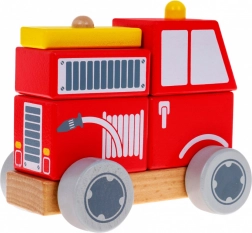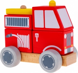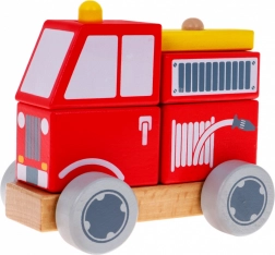 Složite vlastito vatrogasno vozilo od seta drvenih kockica. Dijete stavlja dijelove na dva kolčića na postolju i tako stvara jednostavnu slagalicu koja potiče koordinaciju ruka–oko, strpljenje i logičko razmišljanje. Glatko obrađeno drvo i postojane boje prijateljske su za dječje ruke i okoliš.