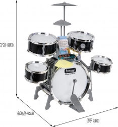 Multifunkcionalni dječji set bubnjeva sadrži 5 bubnjeva, 2 elektronična činela (plastična) i jednu metalnu činelicu, upravljačku ploču, mikrofon, 2 palice i 6 kartica s notama za lako učenje sviranja. Set se napaja s tri AA baterije ili USB kabelom.