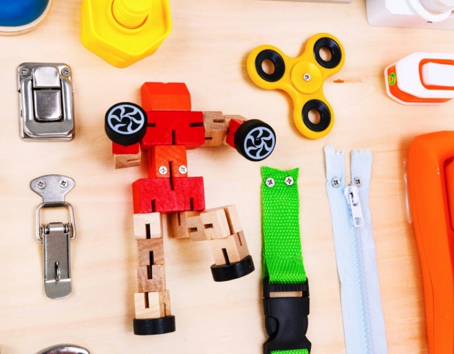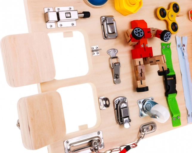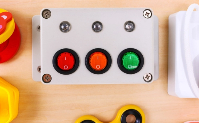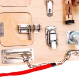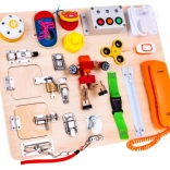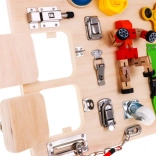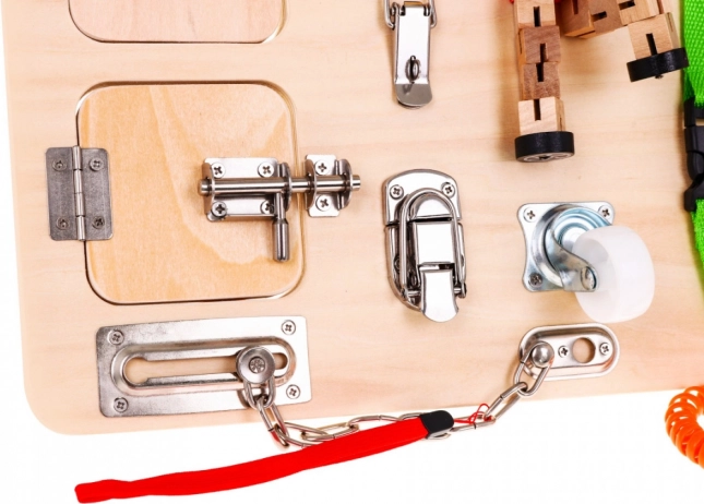 Ploča sadrži brojne interaktivne elemente poput brava, prekidača i povratnih mehanizama, koji potiču razvoj fine motorike i učenje uzročno‑posljedičnih odnosa.