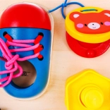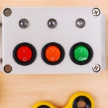 Drvena multifunkcionalna ploča osmišljena je tako da djeci pruži senzorna i manipulativna iskustva. Sadrži elemente koje dijete uobičajeno susreće u svakodnevnom životu i pomaže razumjeti kako funkcioniraju. Uključuje zvučne (zvonce) i svjetlosne elemente (prekidači s diodom), što povećava njezinu interaktivnu vrijednost. Ploča se napaja s 2 AA baterije koje nisu uključene u pakiranje.