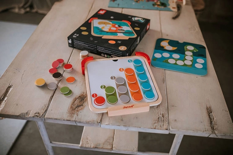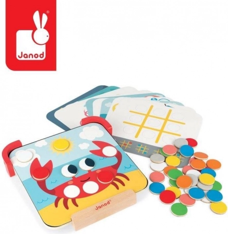 Magnetička edukativna igra Učim boje brenda JANOD nudi sveobuhvatnu aktivnost za male istraživače. Sadrži drvenu magnetičku ploču s postoljima, 42 šarena magnetička kružića, 10 obostranih predložaka sa zadacima i kredu. Djeca postavljaju magnete na točna mjesta prema predlošcima, vježbaju boje, uzorke i koncentraciju – a ploču mogu koristiti i za crtanje te prve pokušaje slova ili brojeva.