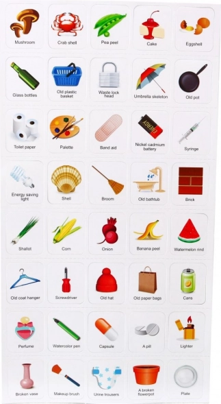 Dio seta je slikovni kartični priručnik koji objašnjava kako pravilno razvrstavati otpad: zeleni – kuhinjski/bio otpad, plavi – reciklabilni otpad, sivi – miješani otpad, crveni – opasni otpad. Zahvaljujući tome djeca prirodno usvajaju ekološke navike i odgovornost prema okolišu.