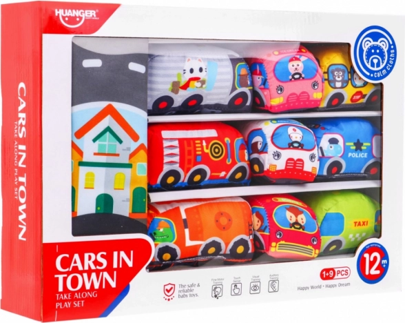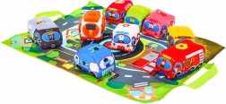 Ovaj svestrani set potiče kreativnost i maštovitu igru djece od 12 mjeseci. Devet šarenih vozila – primjerice školski autobus, vatrogasno vozilo, hitna pomoć, taksi, policijski auto, miješalica, kamion, prodavač sladoleda i kamion s krafnama – poziva na istraživanje grada otisnutog na mekoj podlozi.