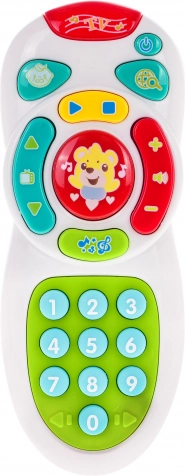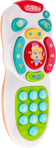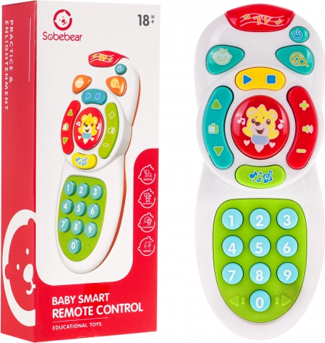 Interaktivni, multifunkcionalni daljinski upravljač sa zvučnim i svjetlosnim efektima za djecu od 18 mjeseci. Igračka je izrađena od najkvalitetnije plastike i nema oštrih rubova. Ima velika tipkala za aktiviranje zvučnih i svjetlosnih efekata, pa se može udobno upravljati malim dječjim ručicama. Ispod svake tipke nalaze se zabavne melodije i zvukovi, tu je i tipka za pokretanje i zaustavljanje igračke te tipka za upravljanje glasnoćom. U sredini daljinskog upravljača nalazi se velika tipka s crtežom medvjedića koja treperi tijekom reprodukcije glazbe. Tipka na gornjem dijelu daljinskog upravljača s natpisom TV također je osvijetljena. Igračka se napaja baterijama tipa 3 x 1,5 V AAA, baterije nisu uključene u pakiranje. .Specifikacija igračke: .- bajkovite boje, .- set ugrađenih melodija, .- dodatni zvukovi - otkucaji srca, zvukovi životinja, brojevi od 0 do 9 na engleskom, .- trepćuća LED dioda na tipki s crtežom medvjedića, .- osvjetljenje tipke TV pri pritisku bilo koje tipke, .- velika tipkovnica s tipkama označenima brojevima, .- kontrola glasnoće. |