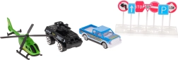 - konstruktivni dijelovi parkirališta, igraća podloga, 2 metalna autića, helikopter, 7 prometnih znakova, dekorativne naljepnice, slikovni priručnik