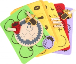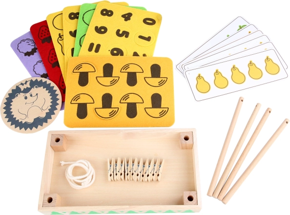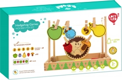 Set uključuje drvenu bazu, malog ježića, zabavne kartice i šarene filcane podloške - idealno i za zajedničku igru više djece. Za lako spremanje, sve je upakirano u praktičnu pamučnu vrećicu.