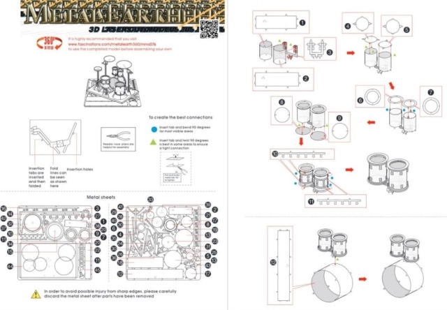 Pojedine dijelove izvadite iz metalnih pločica; po potrebi upotrijebite male grickalice/škare za rezanje (nisu uključene). Dijelovi se spajaju pomoću zasuna koje čine jezičac i otvor. Jezičac savijte uz pomoć malih tankih kliješta (nisu uključena) i postupno spojite sve zasune dok ne nastane vrlo realističan majstorski uradak!
