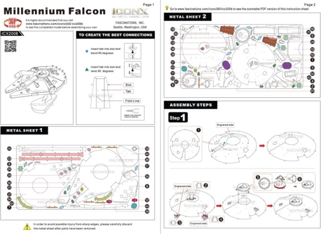 Pojedine dijelove izvadite iz metalnih pločica; po potrebi upotrijebite male bočne rezače (nisu uključeni). Dijelovi se međusobno spajaju pomoću zasuna koji se sastoje od kukice (jezička) i otvora. Jezičak savijte pomoću malih tankih kliješta (nisu uključena) i postupno spojite sve zasune dok ne dobijete vrlo realističan remek-djelo!
