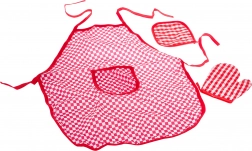 Dio seta je karirana kuharska pregača, rukavica i držač za pribor kako bi mali kuhari imali sve pri ruci i mogli se odmah po raspakiranju baciti na posluživanje i miješanje.