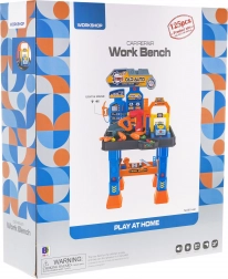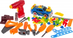 Set sadrži 125 dijelova opreme: alate (čekić, pilu, kliješta, ključeve), vijčani odvijač na baterije, vijke, bitove, nastavke i dekorativne naljepnice. Autić se može rastavljati i prepravljati, što potiče tehničko razmišljanje i koordinaciju ruka–oko. Stabilan radni stol lako se sklapa i idealan je za igru kod kuće.