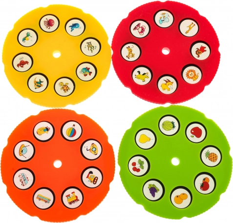 Četiri šarena koluta nude po 8 motiva – od životinja i voća do vozila. Djeca uče oblike i boje te na zabavan način vježbaju crtanje.