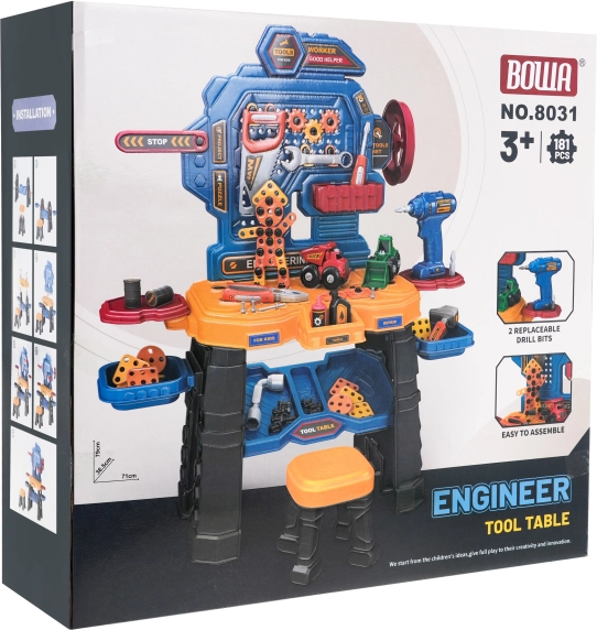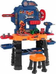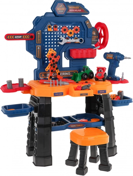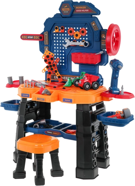Ovaj šareni radionički set pretvara dječju sobu u pravu mini radionicu. Robusni radni stol s policama i organizerom nadopunjuje udoban stolić i aku bušilica na baterije (2× AA, nisu uključene). Djeca mogu zavrtati, bušiti i slagati vlastite projekte, uključujući dva građevinska vozila – utovarivač i kiper.
