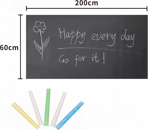 Pretvorite zid u kreativni prostor: samoljepljiva ploča za kredu dimenzija 200 × 60 cm idealna je za dječju sobu, kuhinju i ured. Lako se lijepi, može se po potrebi rezati i višekratno je upotrebljiva. Pisanje i crteže jednostavno obrišite vlažnom krpom. U pakiranju je 5 obojenih kreda.