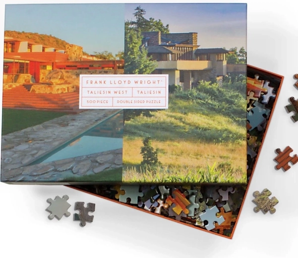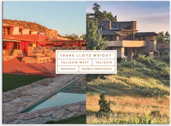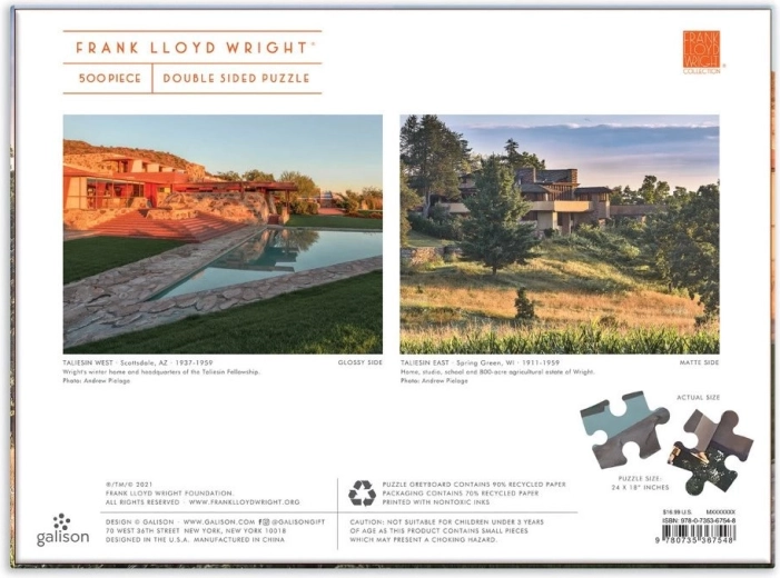 Otkrijte dva remek-djela u jednom pakiranju. Ova dvostrana slagalica donosi dojmljive prizore ikoničnih građevina Taliesin i Taliesin West, povezanih s imenom vizionarskog arhitekta FRANK LLOYD WRIGHT. Zahvaljujući različitim završnim obradama – sjaj s jedne strane i mat s druge – slaganje je pregledno, zabavno i prikladno za širok krug ljubitelja slagalica.