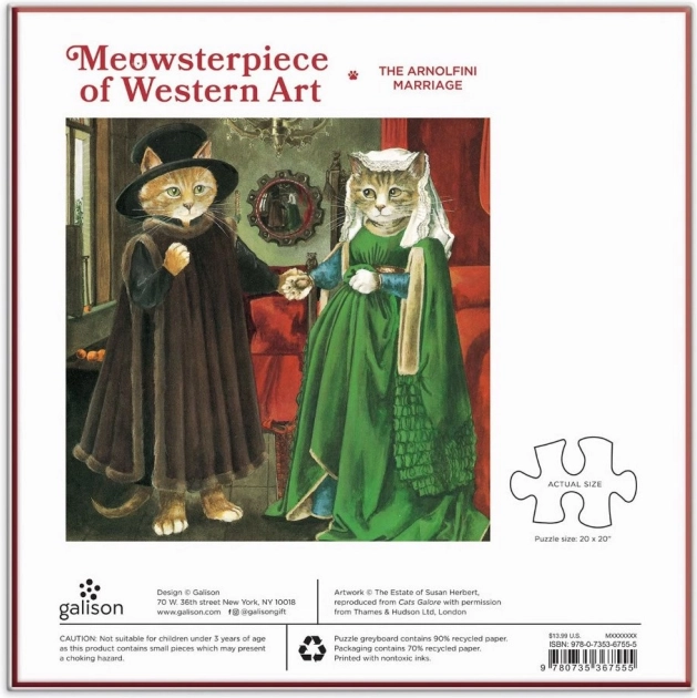 Uđite u svijet umjetnosti s osmijehom. Slagalica Meowsterpiece: Arnolfinijeva ženidba donosi mačju interpretaciju slavne slike Jana van Eycka u izvedbi Susan Herbert. Zahvaljujući 500 pažljivo izrađenim dijelovima i kvadratnom formatu, nakon slaganja nastaje slika dimenzija oko 51 × 51 cm koja će se istaknuti i na stolu i na zidu.