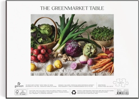 Uživajte u zahtjevnom, ali ukusnom slaganju s puzzleom GALISON Greenmarket Table od 1500 dijelova. Vrhunski tisak s neškodljivim bojama, mat završna obrada za vjerne boje i detalje te čvrsta kutija za višekratnu upotrebu. Proizvedeno od recikliranog papira s naglaskom na održivost. Ilustracija umjetnice Bella Karragiannidis.