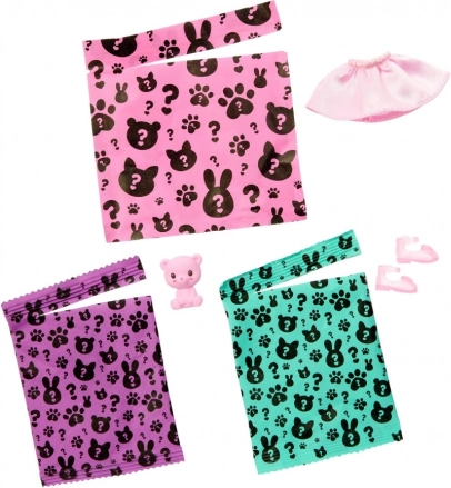 - Lutka Chelsea u kostimu, 3 vrećice s iznenađenjem (suknjica, cipelice, mini životinjica), dodaci