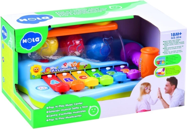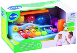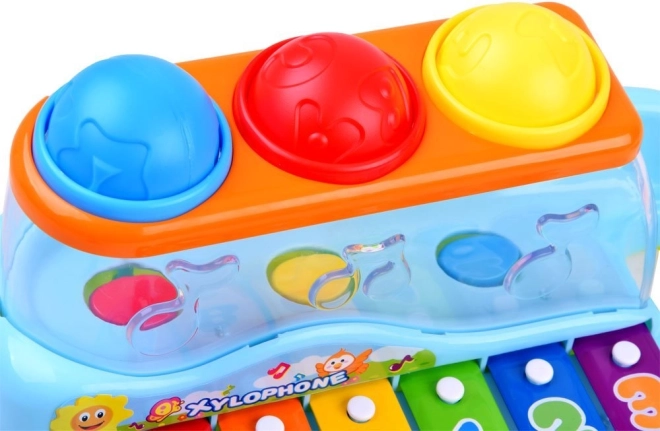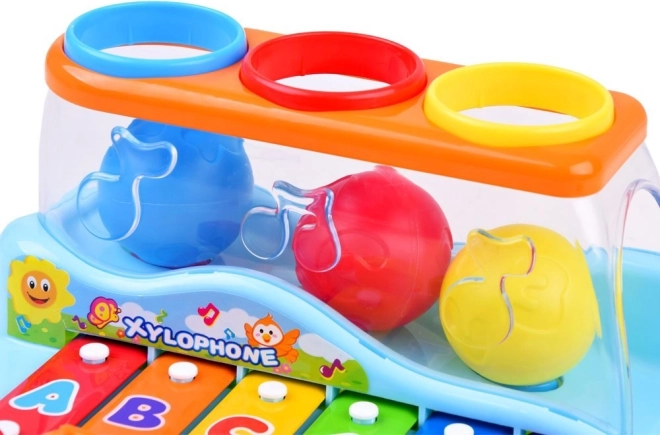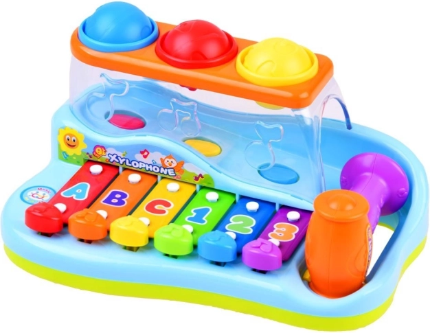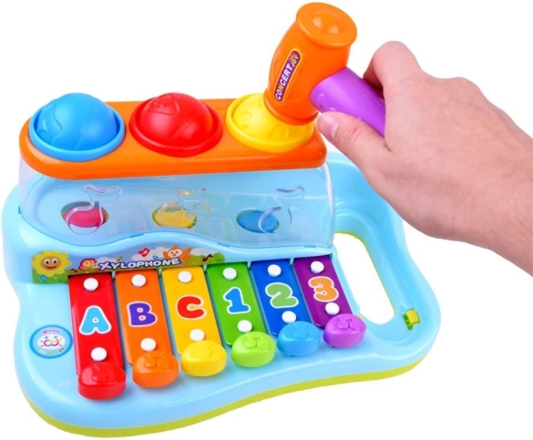 Djeca mogu udarati čekićem po tipkama ili ubacivati loptice kroz otvore, čime iz igračke izlaze dodatne ugodne melodije. Tipke su označene brojevima i slovima, što dodatno pomaže djeci učiti i pamćivati redoslijed udaraca. Ovaj ksilofon savršen je način za poticanje znatiželje i interesa za svijet kod male djece.