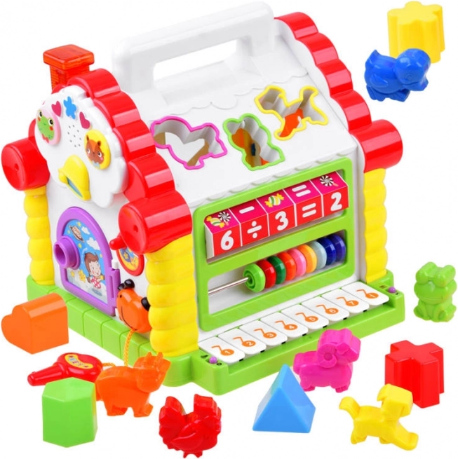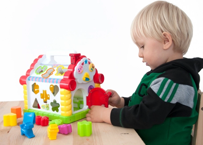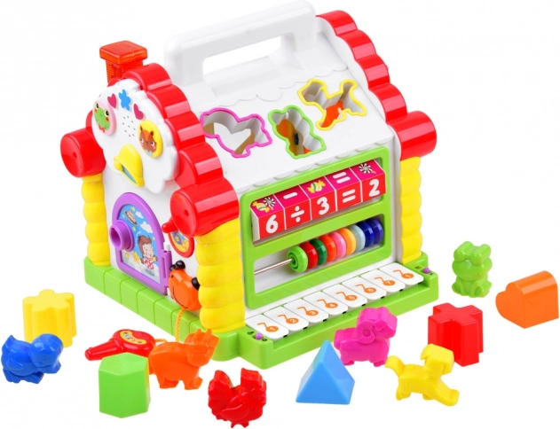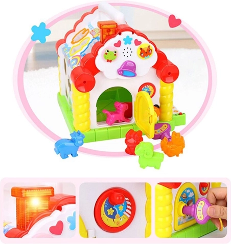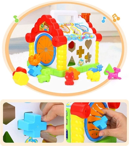 Kućica omogućuje djeci umetanje različitih oblika i životinja u odgovarajuće otvore, što stimulira njihovu finu motoriku i prepoznavanje oblika i zvukova.
