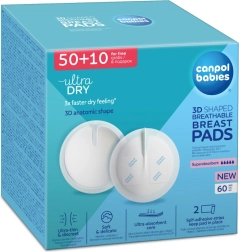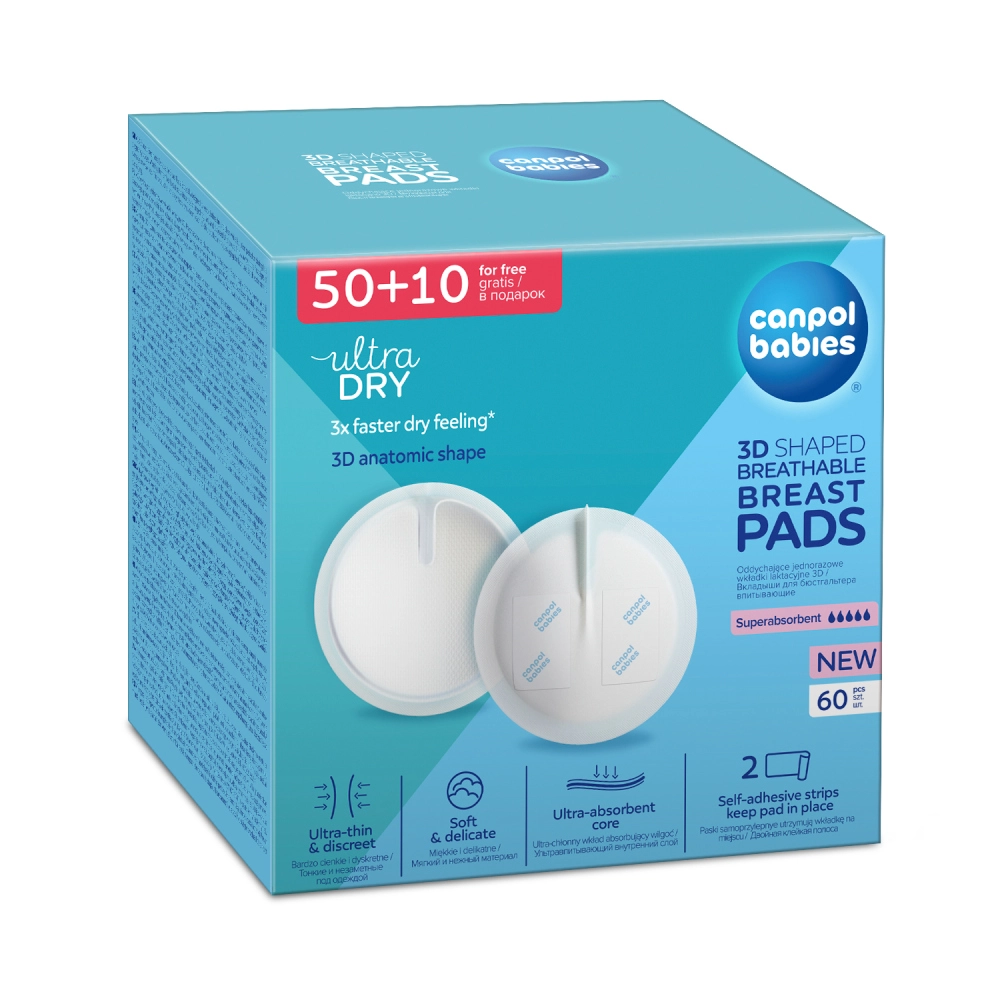 Jednokratne prsne uloške Canpol babies s 3D anatomskim oblikom idealne su za trudnice i dojilje. Nude ultraapsorbirajuću jezgru, prozračan i mekan gornji sloj te nepropusnu donju barijeru koja štiti rublje od promočivanja. Zahvaljujući 2 ljepljive trake pouzdano stoje na mjestu, vrlo su tanke (1,3 mm), diskretne i pružaju brz osjećaj suhoće. Pakiranje sadrži 60 komada (50 + 10 gratis).