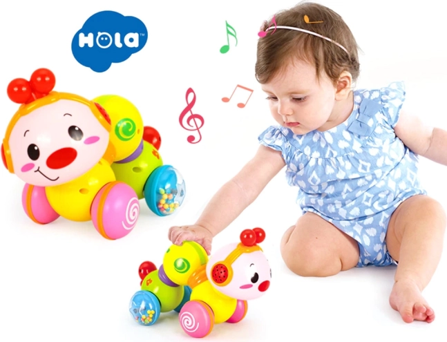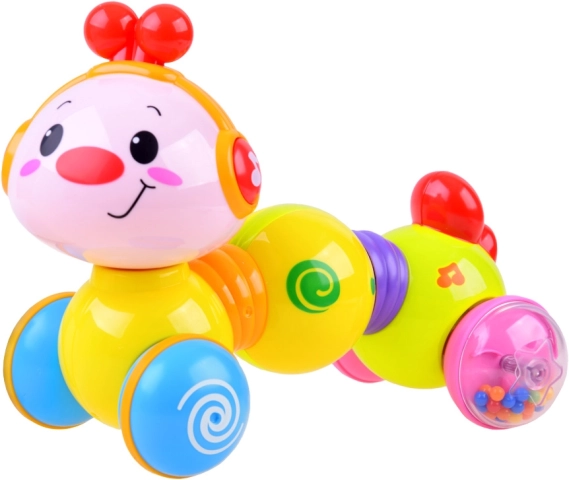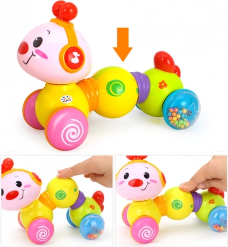 Pritisnite leđa i gusjenica će se rastegnuti i krenuti naprijed. Odlično motivira na puzanje i potiče grubu motoriku.
