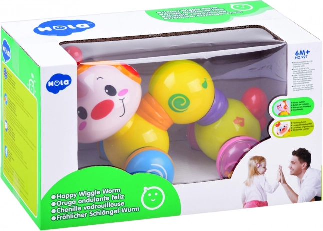 Interaktivna gusjenica na kotačićima Happy Wiggle Worm idealna je igračka za bebe i malu djecu. Nakon pritiska na leđa gusjenica se rastegne i krene naprijed po ravnoj podlozi, dok glavica mijenja boje i sviraju ugodne melodije. Okretna glava potiče znatiželju i finu motoriku.