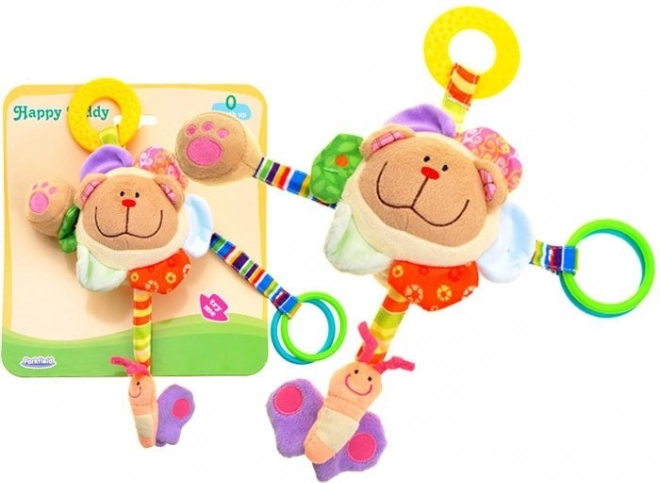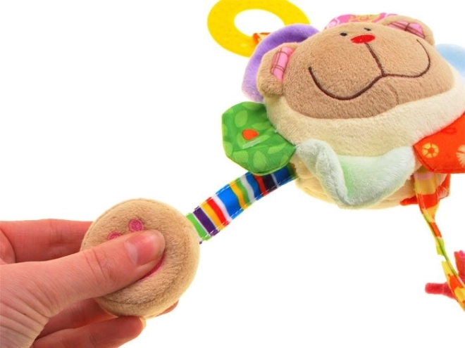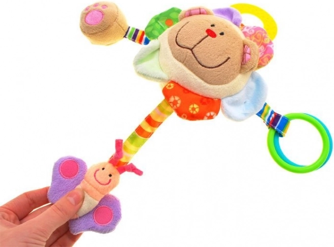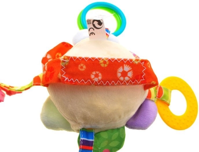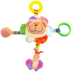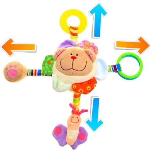Unutar glavice nalazi se zvečkasta kuglica koja pri protresanju stvara nježan zvuk, idealan za privlačenje pažnje i poticanje na pokret. Viseća igračka sadrži četiri šarene vrpce s različitim elementima za igru: