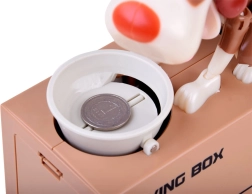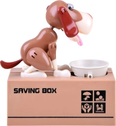 Ubacite kovanicu u zdjelicu ispred psa. Pas se počne micati kao da jede hranu iz zdjelice, što uzrokuje da kovanica padne u kasicu. Pas se pri tome veselo kreće i trese ušima. Za rad su potrebne 3 baterije. Kasica pomaže djeci shvatiti da je štednja ne samo zabavna, već donosi i pozitivne rezultate.