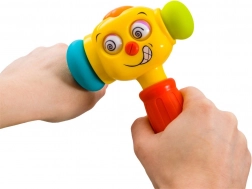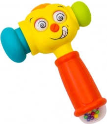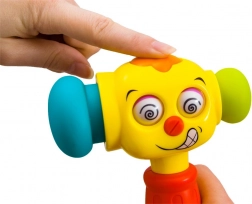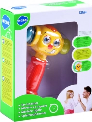 Veseli interaktivni čekić privlači djecu šarenim dizajnom, smiješnim licem te kombinacijom svjetlosnih i zvučnih efekata. Pritiskom gornjeg gumba reproducira 5 zabavnih melodija, a tijekom igre svijetli lampica na vrhu. Svaki udarac dodatno pokreće efekte koji podupiru prirodnu znatiželju i potiču daljnje otkrivanje.