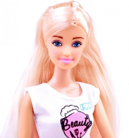 Duga plava kosa, moderan outfit i pregača – idealna partnerica za male kuharice i kuhare.