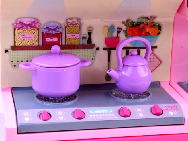 Detaljna peć, sudoper, ormarići i pećnica s vratima koja se otvaraju za autentičnu igru kuhanja.