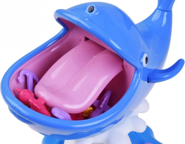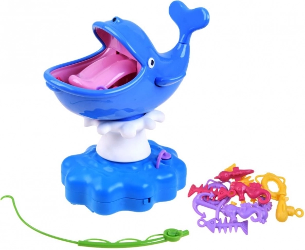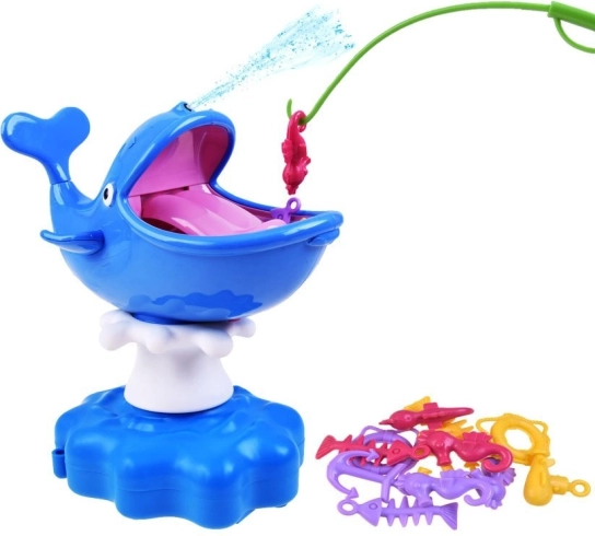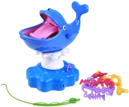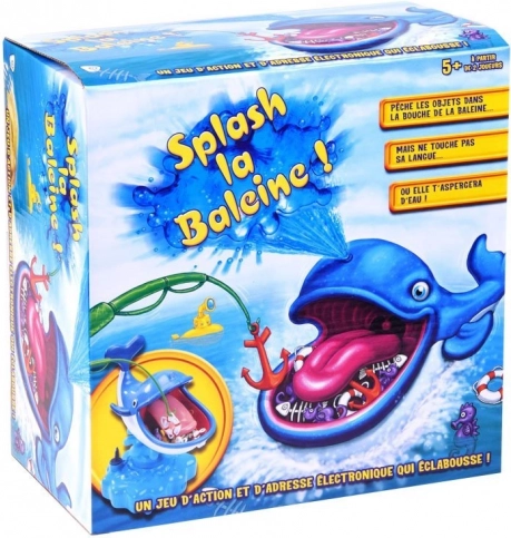 Vodena igra s kitom sjajna je interaktivna zabava za cijelu obitelj. Djeca vježbaju finu motoriku, strpljenje i koordinaciju oko–ruka dok se natječu u lovu sidra, spasilačkih prstenova ili ribljih kostura izravno iz usta nasmijanog kita. Ali oprez – dodir jezika pokreće vodeni špric!