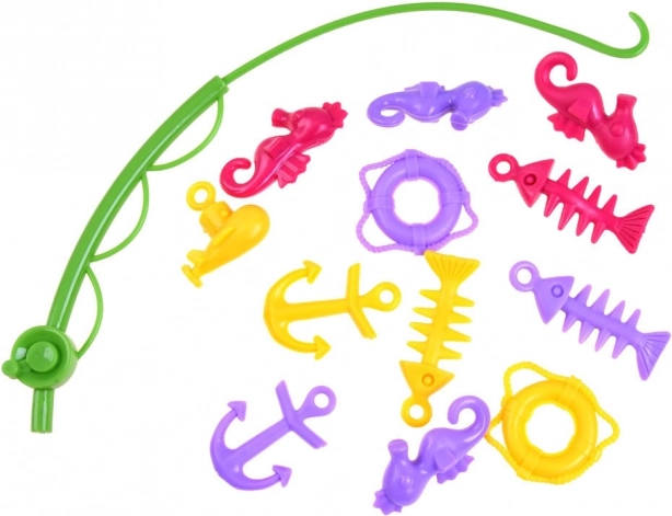 Set sadrži štap za hvatanje i niz šarenih morskih blaga koja potiču djecu na ponovnu igru i vježbanje spretnosti.