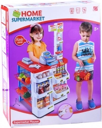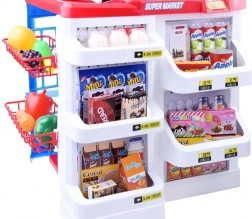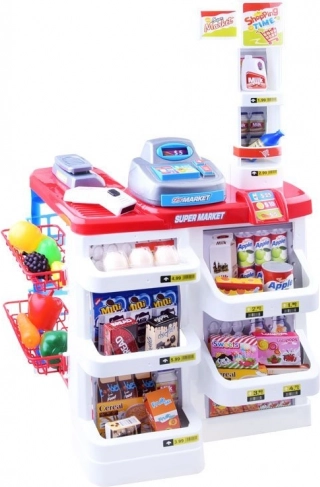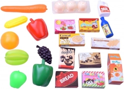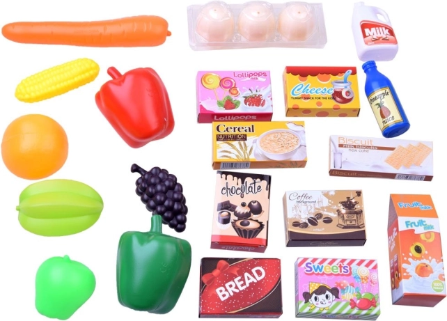 Set uključuje razne vrste realistički izgledajuće plastične hrane koju djeca mogu istraživati i koristiti u svojoj imaginarnoj trgovini.