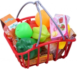 Praktična crvena košarica za prenošenje sitne robe, što djecu uči organizirati i prenositi kupovinu.