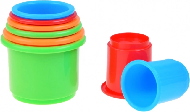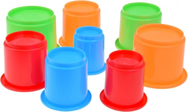 Set sadrži 8 čašica u živim bojama koje se spremaju jedna u drugu i štede prostor. Isporučuje se u šarenoj poklon-kutiji – izvrsna ideja za rođendanski poklon i kao prva razvojna igračka.