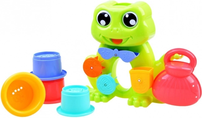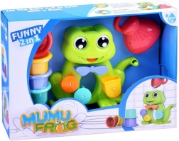 Slatka žabica za kadu donosi djeci puno zabave tijekom kupanja. Ulijevajte vodu u žabinu glavu i promatrajte kaskadu rotirajućih bubnjeva koja stvara vesele vodene efekte. U kompletu su 4 šarene slagajuće čašice za ulijevanje, razvrstavanje i slaganje, koje razvijaju finu motoriku, koordinaciju i kreativnost.