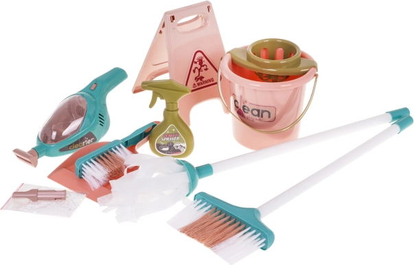 kolica za sastavljanje, ručni usisavač, kanta s mopom, metla, četka, lopatica, ručna metlica, sprej – atrapa, upozoravajuća tabla, polistirenske kuglice, zamjenjivi nastavci za usisavač (usisni i uski), vreća za otpad, dekorativne naljepnice
