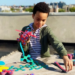 Savitljivi elementi s magnetima omogućuju djeci slaganje plošnih i prostorných modela – od životinja do fantazijskih likova. Igra prirodno razvija finu motoriku, maštu i koncentraciju.