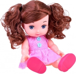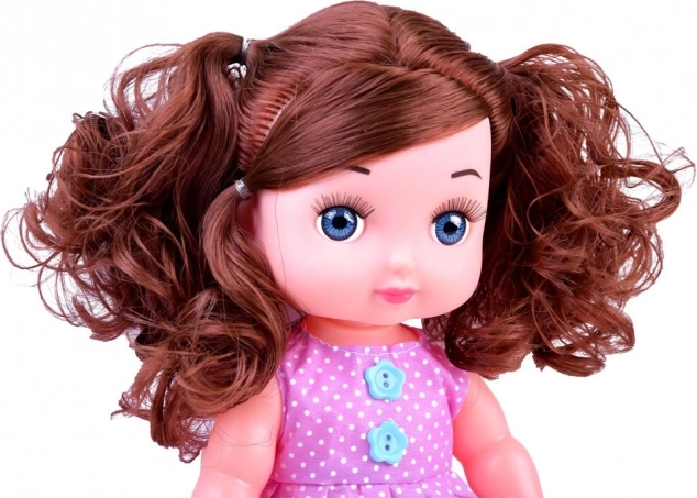 Lutka ima dugu kovrčavu kosu i živopisno plave oči s trepavicama, što joj daje realističan i živ izraz.