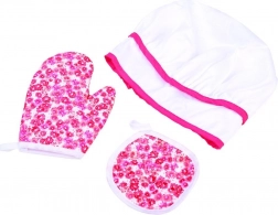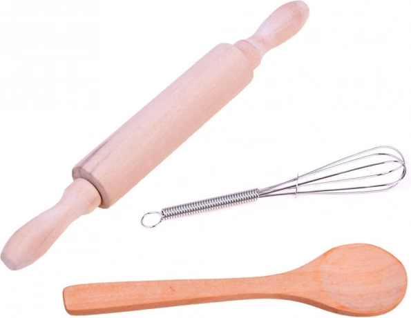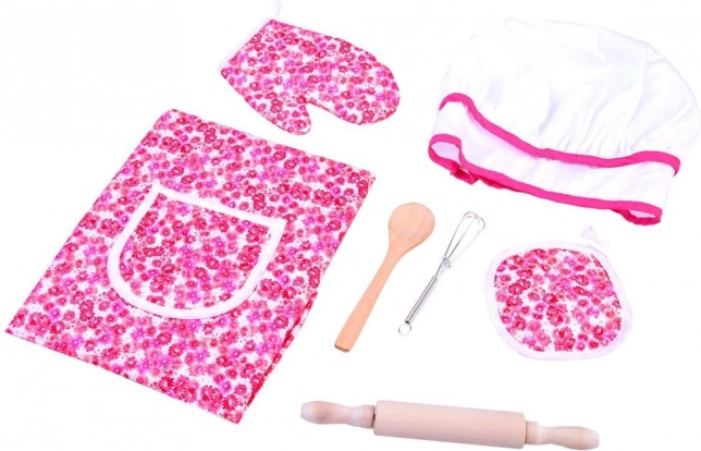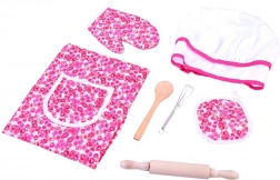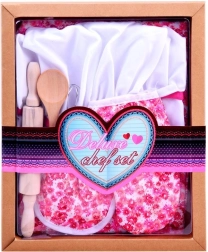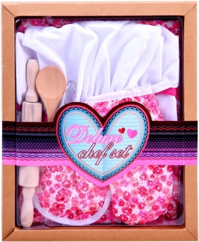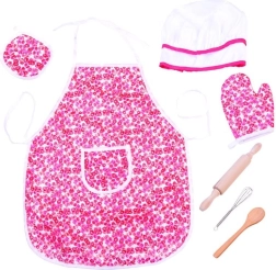Sadrži sve potrebne stvari za malu kuharicu: pregaču, šešir, rukavicu, podlogu i kuhinjske alate.