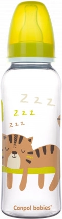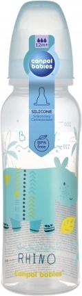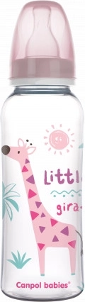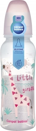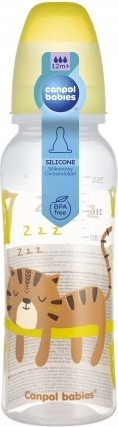 Bočica Canpol babies zapremnine 250 ml izrađena je od kvalitetnog polipropilena koji ne sadrži BPA. Ne puca, sigurna je, lagana, praktična i šarena. Bočica je dostupna u trima varijantama dizajna AFRIKA. Ispunjava najviše zahtjeve kvalitete. U standardnom izdanju sadrži silikonsku okruglu dudu s brzim protokom. Zamjenske dude i nastavke za piće pronađite u odjeljku dude i nastavci za piće. Upute za uporabu: Prije prve i svake sljedeće uporabe bočicu i sve njezine dijelove temeljito operite i dezinficirajte. Dudu iz higijenskih razloga prije prve uporabe prokuhajte 5 minuta u kipućoj vodi. Čistite prije svake uporabe. Nakon uporabe očistite bočicu i dudu od ostataka hrane, isperite i potom sterilizirajte u parnom/električnom sterilizatoru ili u kipućoj vodi. Više ne prokuhavati! Ne preporučujemo prati bočicu i dudu u perilici posuđa jer deterdženti mogu oštetiti proizvod. Ne koristite nikakva kemijska antibakterijska sredstva. Prije svake uporabe provjerite stanje dude. Obratite posebnu pozornost na dudu nakon što djetetu izrastu prvi zubići. Provjerite kvalitetu dude pažljivim istezanjem u svim smjerovima. Pri prvim znacima oštećenja dudu odmah bacite i dalje ne koristite. Navojni poklopac ne zatežite previše, jer se tada duda ne može pravilno odzračivati. Provjerite ne izlazi li hrana ispod navojnog poklopca. Ne bušite i ne povećavajte otvore na dudi – možete je uništiti. Ako zagrijavate hranu u mikrovalnoj pećnici, ne zaboravite da bočica mora biti otvorena. Zagrijavanju u mikrovalnoj pećnici posvetite pojačanu pozornost. Uvijek temeljito promiješajte zagrijanu hranu i provjerite njezinu temperaturu prije davanja djetetu. Ne ostavljajte dudu u blizini izvora topline, na izravnom suncu ili u dezinfekcijskim sredstvima dulje nego što je preporučeno, jer može doći do slabljenja dude. Iz higijenskih i sigurnosnih razloga preporučujemo zamijeniti dudu najviše nakon 2 mjeseca. Upozorenje! Važno za zdravlje i sigurnost vašeg djeteta! Koristite samo pod nadzorom odrasle osobe. Nikada ne koristite dudu kao varalicu. Dugotrajno i produljeno sisanje tekućina može uzrokovati oštećenje zubne cakline djeteta. Uvijek provjerite temperaturu hrane prije posluživanja. Proizvod nije igračka. Sve dijelove proizvoda čuvajte izvan dohvata djeteta. Dječja bočica odgovara zahtjevima: Uredbe Europskog parlamenta i Vijeća 1935/2004/EZ – opći zahtjevi za materijale i predmete namijenjene kontaktu s hranom; Uredbe Komisije (EU) br. 10/2011 o materijalima i predmetima od plastike namijenjenima za kontakt s hranom; EN 14350-1 – Proizvodi za njegu djeteta – Oprema za piće – Dio 1: Opći i mehanički zahtjevi i ispitivanja; EN 14350-2 – Proizvodi za njegu djeteta – Oprema za piće – Dio 2: Kemijski zahtjevi i ispitivanja.