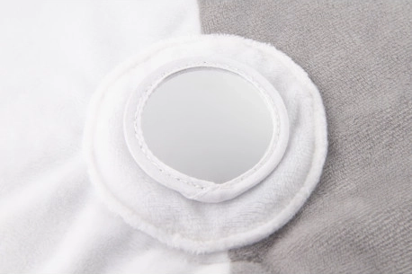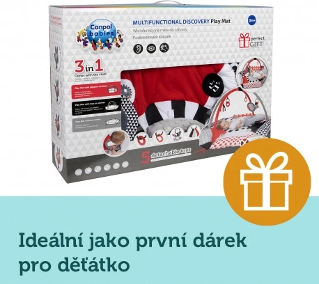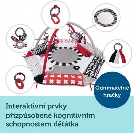 Podloga za igru nudi 5 odvojivih igračaka za stimulaciju osjetila i potporu razvoju: zvečku, grickalicu, ogledalce, šarenu vrpcu i element koji pišti/šuška.