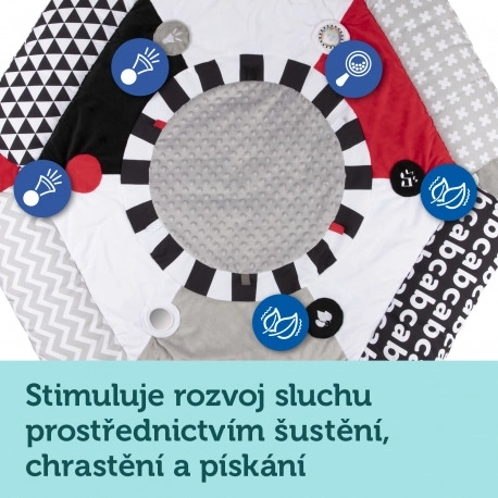 Zahvaljujući kontrastnim bojama i raznovrsnim teksturama, ova podloga pomaže razvijati vid i sposobnost koncentracije već od najranije dobi.