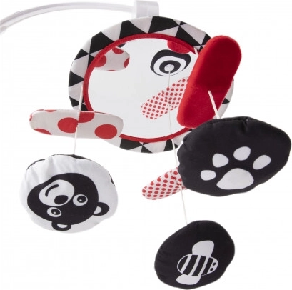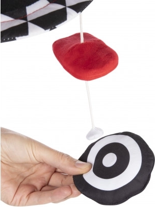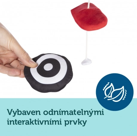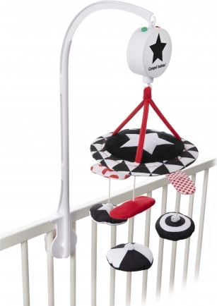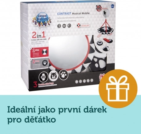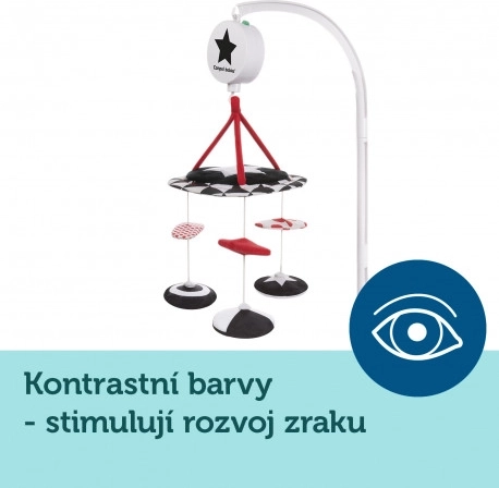 Kontrastna plišana vrteška s melodijama iz kolekcije SENSORY namijenjena je za pričvršćivanje iznad krevetića za najmlađu djecu. Vrteška je opremljena glazbenim mehanizmom, velikim zrcalom i plišanim, odvojivim elementima s ušivenim magnetom. Na vrteški se može reproducirati do 12 melodija koje odlično pomažu pri uspavljivanju. Senzoričke boje i melodije potiču razvoj djetetovih osjetila i njegovu vizualno-slušnu koordinaciju. Više informacija o proizvodu saznajte u ovom videu: https://www.youtube.com/watch?v=xFGM2JqeIwE Zašto su senzoričke igračke toliko važne? Vid djeteta je nakon rođenja najmanje razvijeno osjetilo. Tama koja prevladava u maternici ne dopušta da se vid u prenatalnom razdoblju u potpunosti razvije. Nakon rođenja djetetov je vid zamućen i maglovit. Dijete vidi samo obrise na udaljenosti 20–30 cm, velike oblike i elemente iz okoline. Otprilike nakon mjesec dana počinje uočavati boje, isprva crvenu i crnu. Nakon oko tri mjeseca počinje primjećivati i druge izražajne boje. Približno u dobi od šest mjeseci počinje vidjeti detalje na slikama i vid mu postaje mnogo jasniji. U dvanaestom mjesecu života djetetov je vid već u potpunosti razvijen kao kod odrasle osobe i postaje izvrstan alat za otkrivanje svijeta. Senzoričke igračke iz nove kolekcije SENSORY pomažu stimulirati djetetov vid i trenirati sposobnost koncentracije već od prvih tjedana života. O kolekciji SENSORY: Senzorička kolekcija igračaka razvijena je za djecu do jedne godine. Tijekom tog razdoblja dolazi do najvažnijih promjena u psihomotoričkom razvoju djeteta. Senzoričke igračke odgovor su na aktualni trend na tržištu koji se usmjerava na potporu razvoju kroz zabavu, pri čemu roditelj zajedno s djetetom može poticati razvoj vida, vježbati sposobnost koncentriranja na objekt, usmjeravati i pratiti objekte očima te vježbati spretnost i koordinaciju. Upozorenje: Vrtešku postavite tako da dijete s njom ne može doći u izravan kontakt. Igračku sastavite prema nacrtu (pojedini dijelovi mogu se razlikovati od dijelova na nacrtu). Igračke se kreću, melodije umiruju dijete i olakšavaju mu uspavljivanje. Upute za uporabu: Održavajte u čistoći, glazbeni mehanizam brišite vlažnom krpom ili spužvom. Upute za održavanje plišanih elemenata navedene su na etiketi. Upozorenje! Važno za zdravlje i sigurnost vašeg djeteta! Ne koristite igračku za djecu koja se počinju samostalno podizati na ruke i koljena. Time ćete spriječiti moguće zaplitanje djeteta u igračku. Upozorenje! Sastavljanje i provjeru sastavljene igračke prije uporabe uvijek povjerite isključivo odrasloj osobi. Upozorenje! Važno! Igračku pričvrstite iznad djetetove glavice, u njegovom vidnom polju. Prije svake uporabe provjerite proizvod. Pri prvim znakovima trošenja ili oštećenja proizvod više nemojte koristiti – zamijenite ga novim. Vrteška odgovara zahtjevima: Direktiva Europskog parlamenta i Vijeća 2009/48/EZ o sigurnosti igračaka EN 71 - 1 Sigurnost igračaka - Dio 1: Mehanička i fizikalna svojstva EN 71 - 2 Sigurnost igračaka - Dio 2: Zapaljivost EN 71 - 3 Sigurnost igračaka - Dio 3: Migracija određenih elemenata