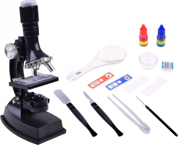 - mikroskop, povećalo, igla, pinceta, sigurni skalpel, špatula, Petrijeva zdjelica, 2× bočica s bojilom, 2× gotov preparat, 2× prazno predmetno stakalce, 5× pokrovno stakalce, 5× prazna etiketa
