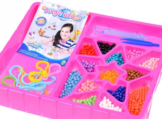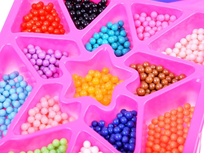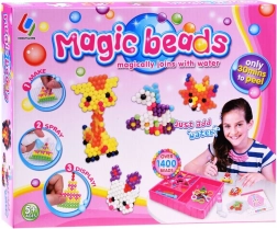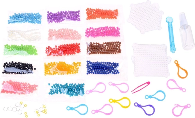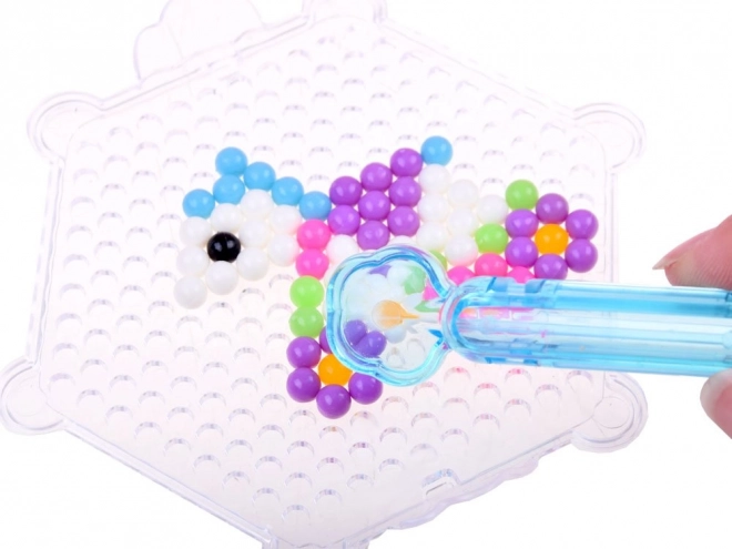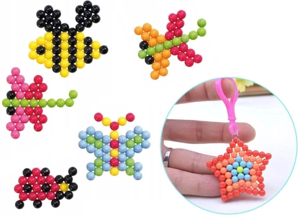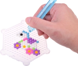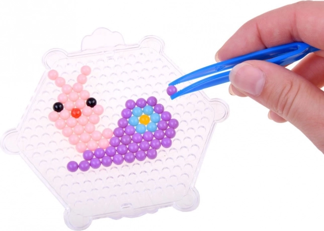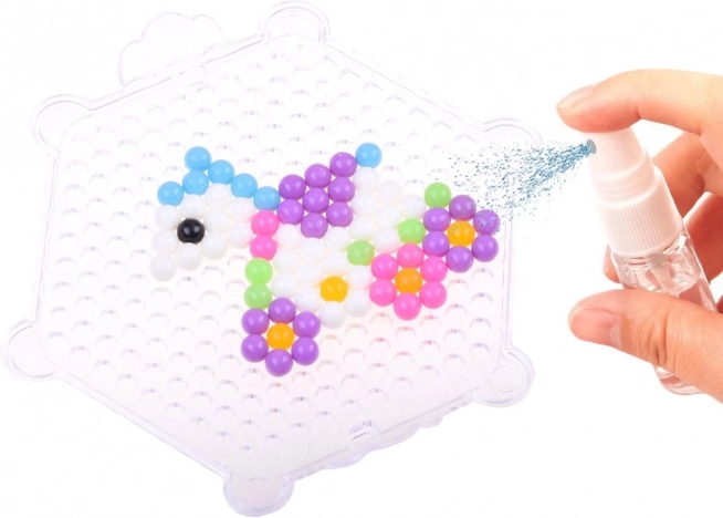 Uz ovaj kreativni set djeca i odrasli mogu stvarati šarene dekoracije na jednostavan i zabavan način. Dovoljno je odabrati motiv iz priložene knjižice, posložiti perlice prema šabloni i pošpricati ih vodom kako bi se povezale.