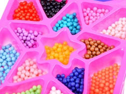 Perlice su razvrstane po bojama u odvojene pretince, što omogućuje jednostavan odabir i uporabu.